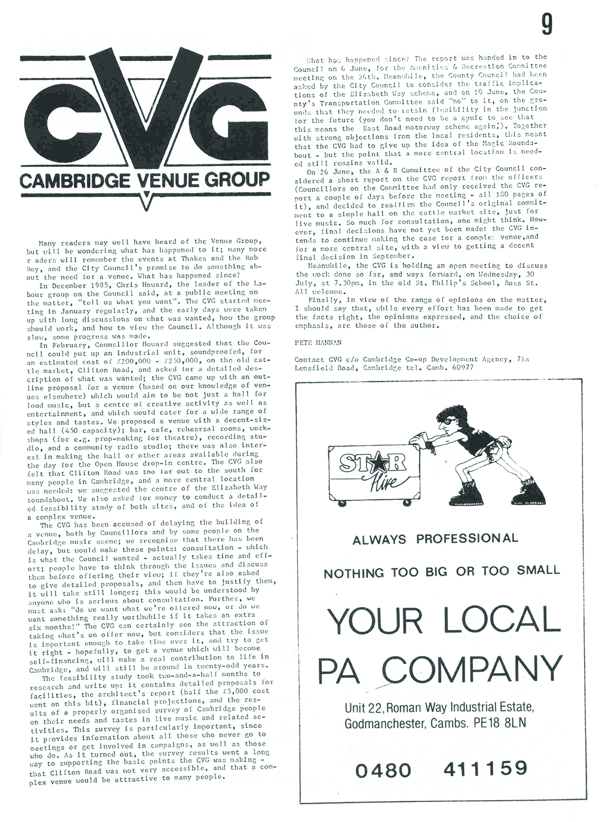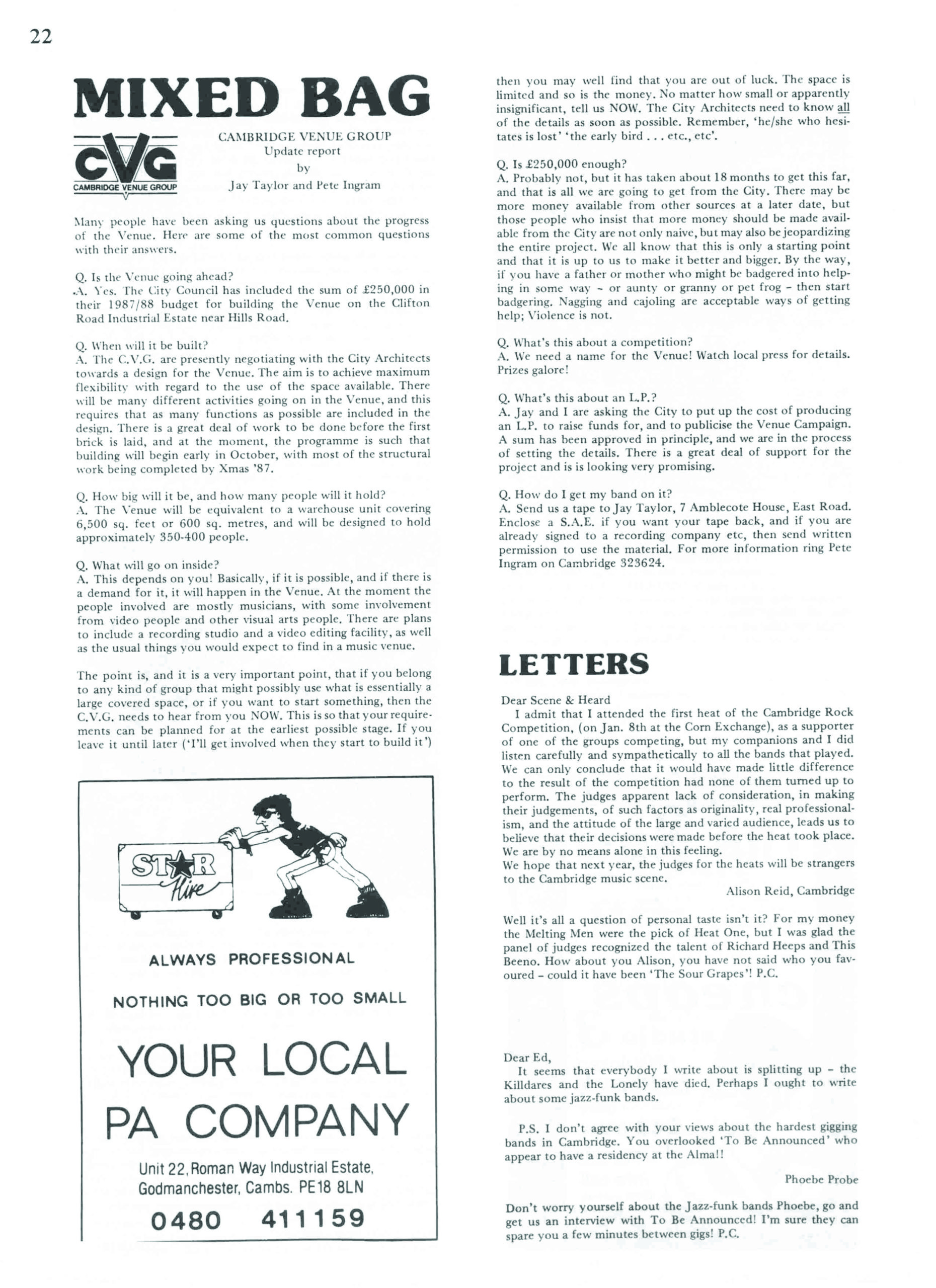In July 1986 an editorial written by Venue Group member Pete Hannon was featured in the local music fanzine of the time Scene and Heard. The article provided a summary of what had gone on so far.It was stated that Chris Howard, the then leader of the Labour group on the council had said at a public meeting held in December 1985 “tell us what you want”.
