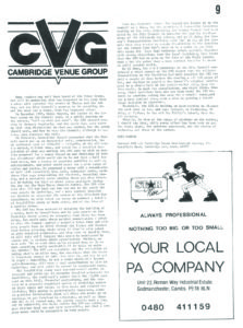 The annals of local history show that one night in 1985 revelers set about holding a disco in a disused cycle shop at the top of Norfolk Street. The riot that ensued when Police arrived was the catalyst for the formation of the Cambridge Venue Group. (CVG) They were a pressure group, put together in order to lobby Cambridge City Council into providing some much needed leisure facilities for city residents.