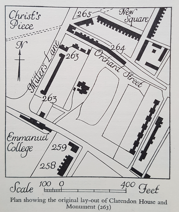 According to Royal Commission Survey of Cambridge 1959: Houses, a pair, now. 5 and 13 Emmanuel Road, standing some 78 yards apart symmetrically between Parker Street and Orchard Street, facing Christ’s Pieces, are of two storeys and have walls of gault brick with stone dressings and slate-covered roofs. They were built as grooms’ houses between 1826 and 1828 and architecturally devised as the small pavilion-like terminal features to a long range on the NW boundary of the grounds of Charles Humfrey’s house, Clarendon House, which stood between Clarendon Street, Victoria Street and earl Street. The range was built by Humfrey for letting as mews but the middle part was leased to the Borough and adapted for use as a police station. It is show on R G Baker’s map pf 1830.