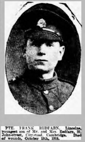 Pte Frank Redfarn, Linc. youngest son of Mr and Mrs Redfarn, 22 John Street. Died of wounds 13 Oct 1918, He had three brothers who were also serving.