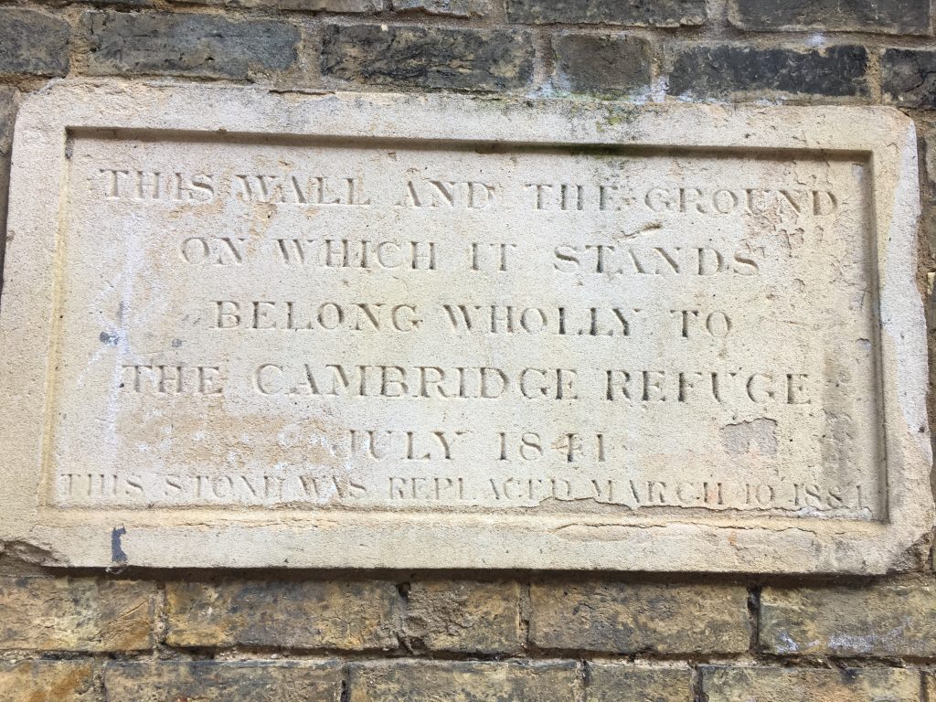 This plaque is on the wall behind the Grafton centre. The wall borders Stanton House. The plaque reads ‘This Wall and the ground on which it stands belong wholly to The Cambridge Refuge July 1841. This stone was replaced March 1881.’