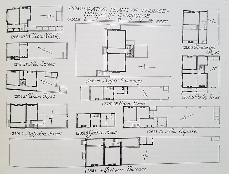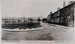 The first notice of a resident in New Square appears in 1825 (Camb. Chronicle 1 April) although the earliest leases in the books of Jesus College, the landlords, are of 1829 and 1830….. Though generally uniform except for the pedimented centrepiece to each terrace, the houses have minor variations on plan for they were evidently built by different persons on building leases from Jesus College and some by the Society itself.