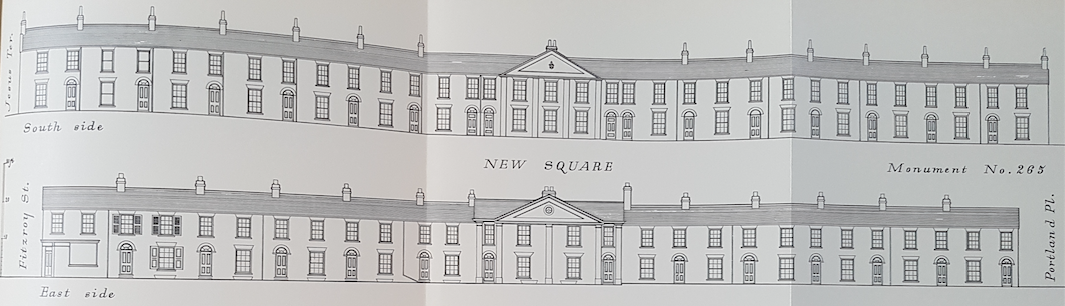 New Square, north terrace, CambridgeRoyal Commission Survey of Cambridge 1959: New Square, a large open space extending from Emmanuel Road opposite the NE corner of Christ’s Piece, bounded on the E andante greater part of the N and S by terrace-houses, Nos. 1 to 47 and Not. 2 Fitzroy Street, was an entirely new development, to a single coherent design, the second quarter of the 19th century. Only two houses, Nos. 34 and 35, have since been rebuilt….