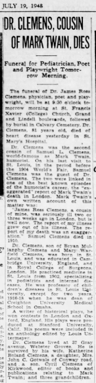 Obituary of James Ross Clemens, 1948, St Louis Post