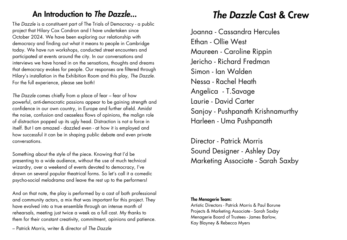 The Dazzle, written and directed by Patrick Morris, was performed four times over the weekend of October 4-5th 2025 in the old Courthouse at Cambridge Guildhall.