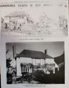 I was given the task of visiting each house in The Sector in case of injury and was horrified to see, in a few minutes, a Barrow Road house go up in flames…..the householder was found behind th window curtains, as if he’d been looking out; the bomb had hit the gas main nearby. His wife, in the kitchen, escaped harm.
