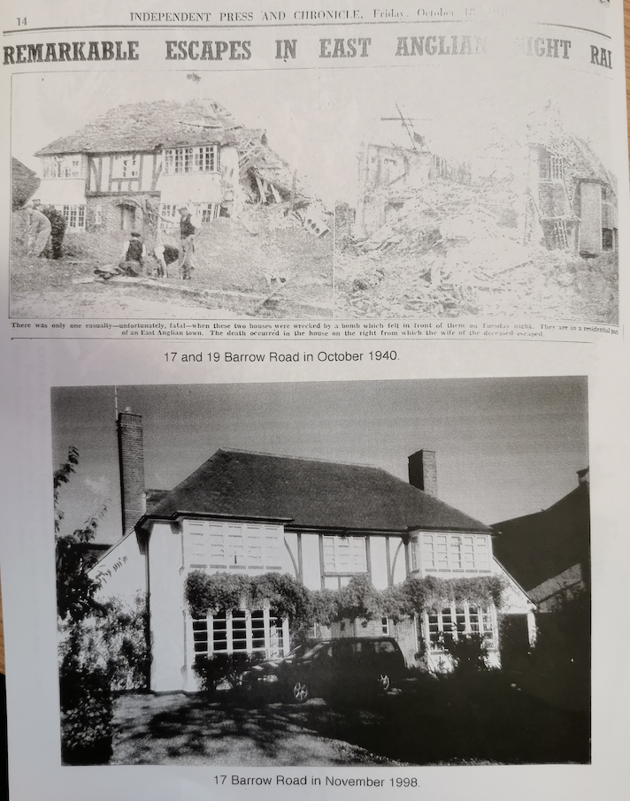 Michael Bowyer in Air Raid! pub. 1986 p. 101, describes in detail the bombing of 19 Barrow Road. He reports the words of the Cambridge ARP warden confronted with the aftermath of a HE bomb dropped by a He 111: