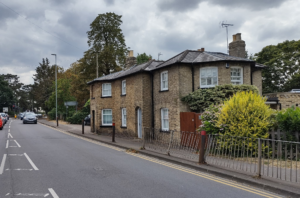 The Toll House and Weighbridge House in the 1920s. Percy Robinson.The High Street follows the route from the south to Cambridge. From the 1720s, two turnpike roads merged here: from Barkway (Hauxton Road) and Great Chesterford (Shelford Road) . The tollhouse on the west side of the High Street was built in 1811, with a weighbridge added to its right in 1863.